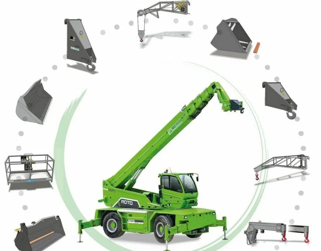 Dzięki osprzętowi ładowarka teleskopowa jest systemem wielofunkcyjnym w wielu gałęziach przemysłu. Podstawowa maszyna w ciągu zaledwie kilku minut zmienia się z ładowarki – w wózek widłowy – w dźwig itp. Dużą popularnością cieszą się hydrauliczne wciągarki linowe Merlo o udźwigu do 10 t.